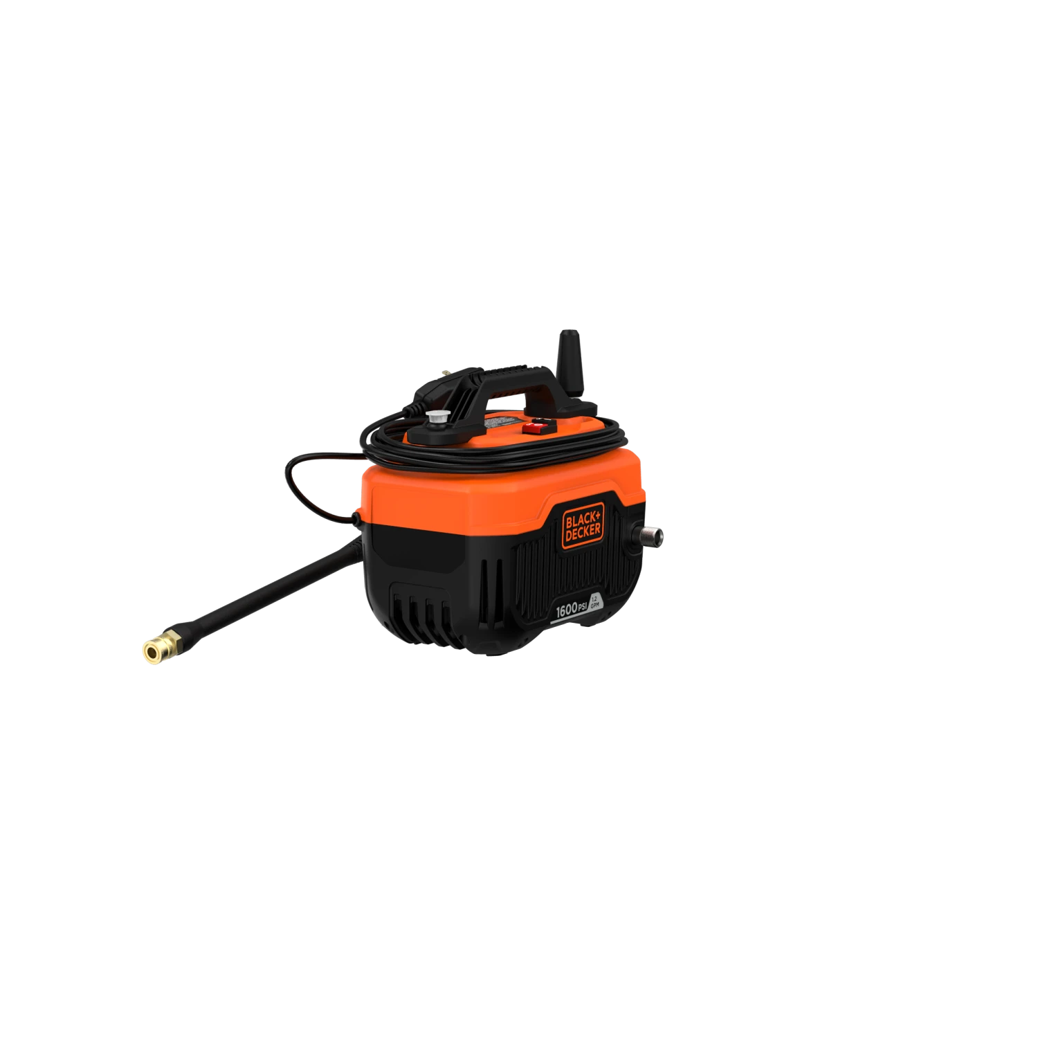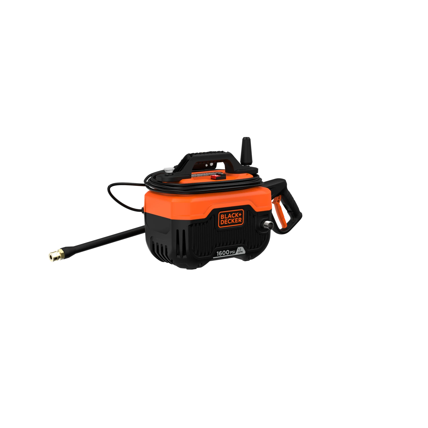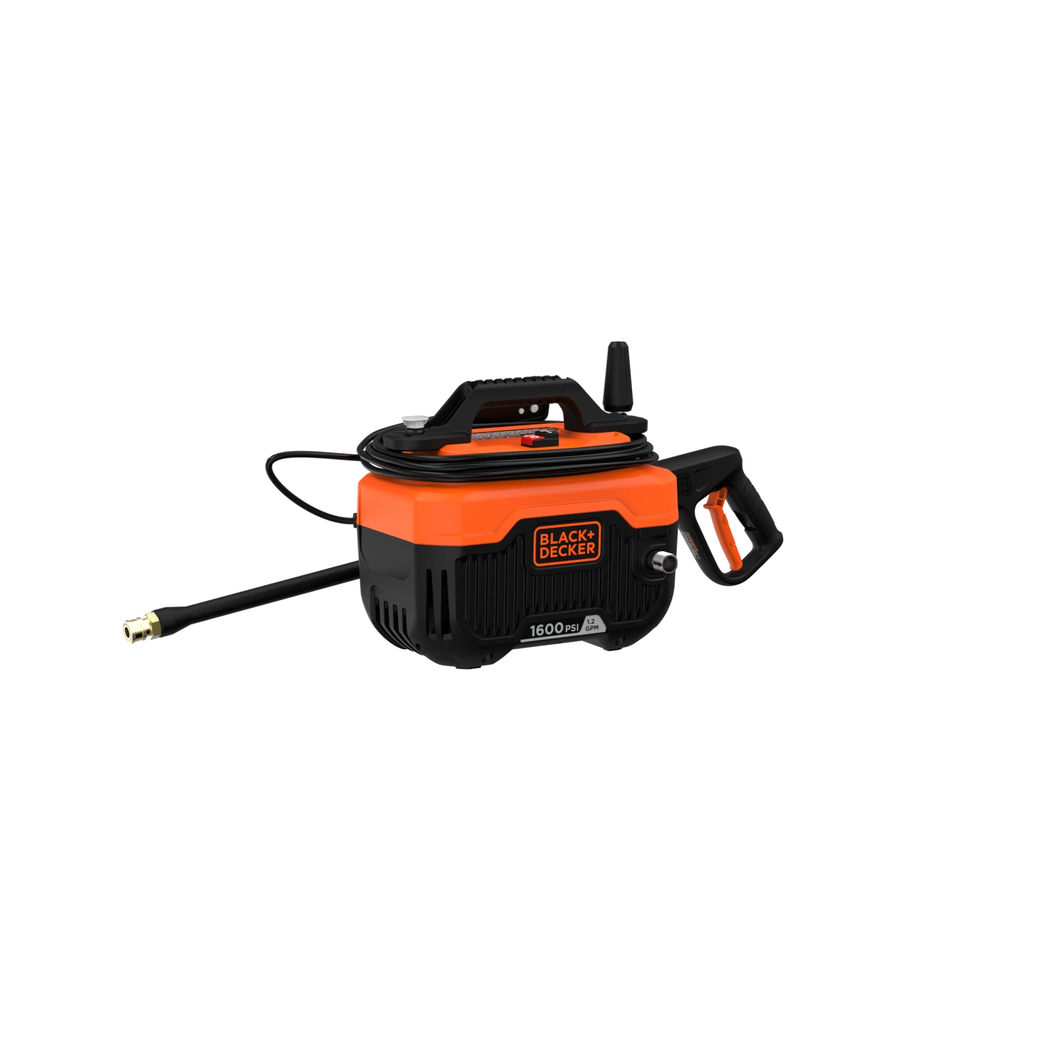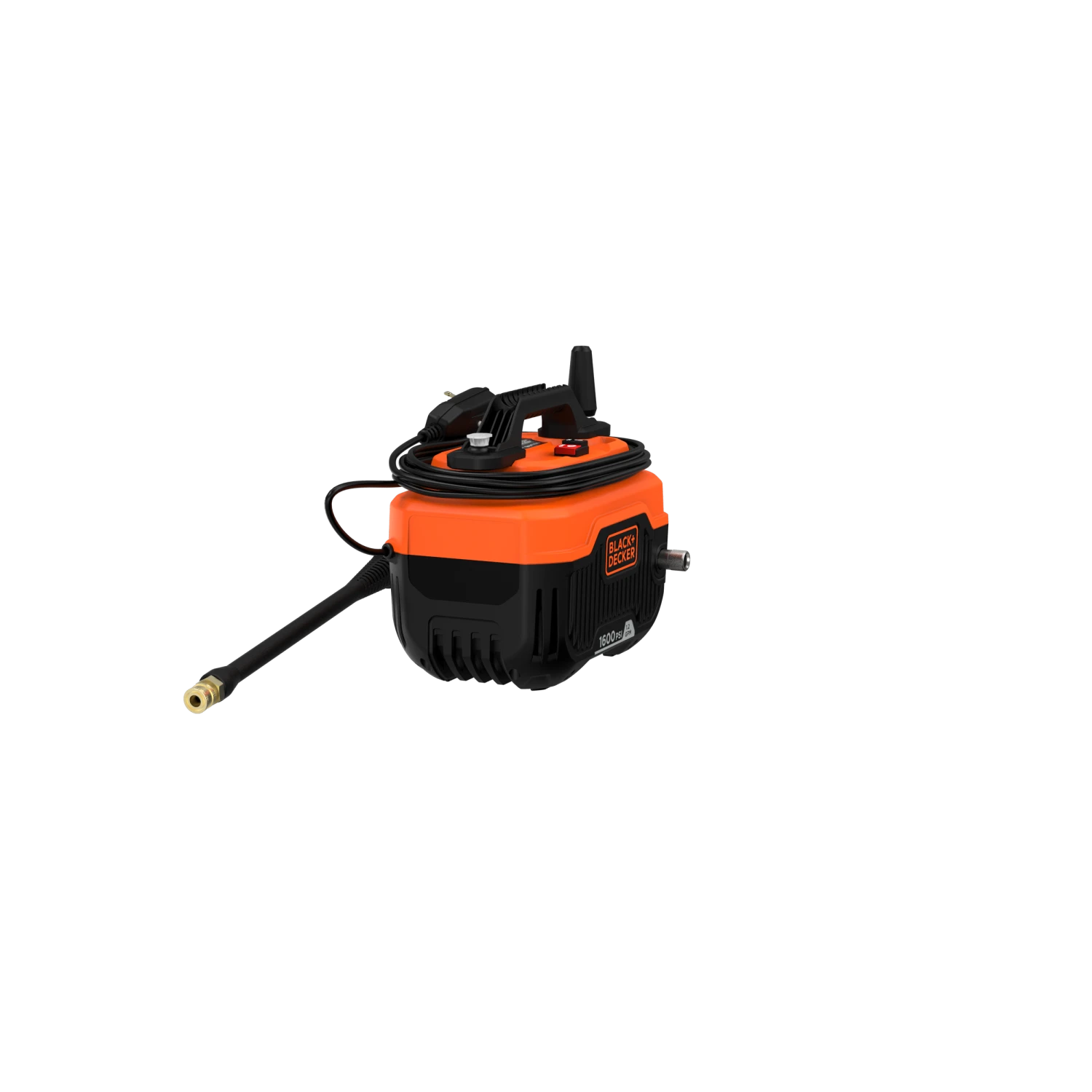 BLACK+DECKER® 1,600 max psi 1.2 gpm electric corded cold water pressure washer includes a power cord, hose, turbo nozzle, and a 40 degree nozzle that delivers up to 145% more* cleaning width.