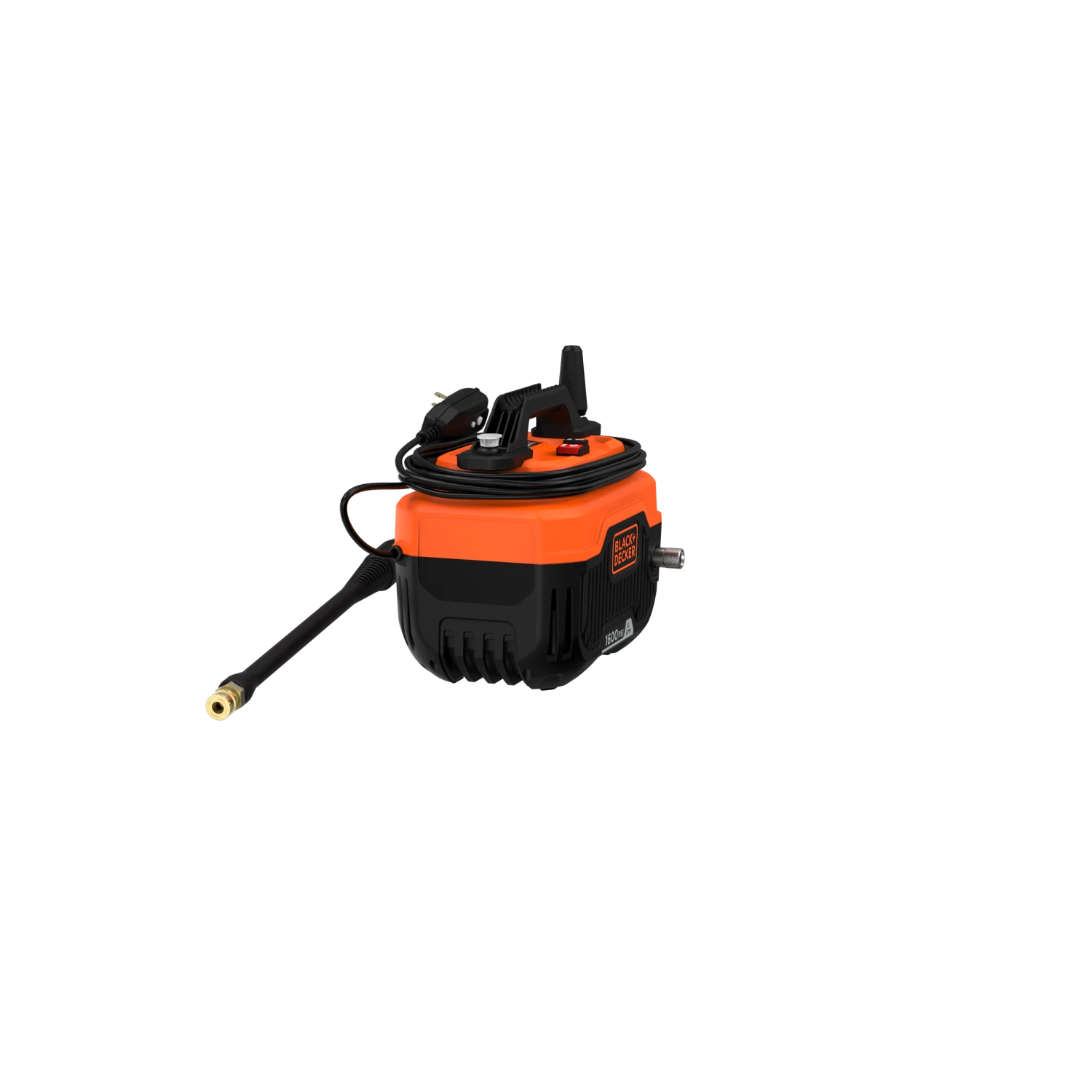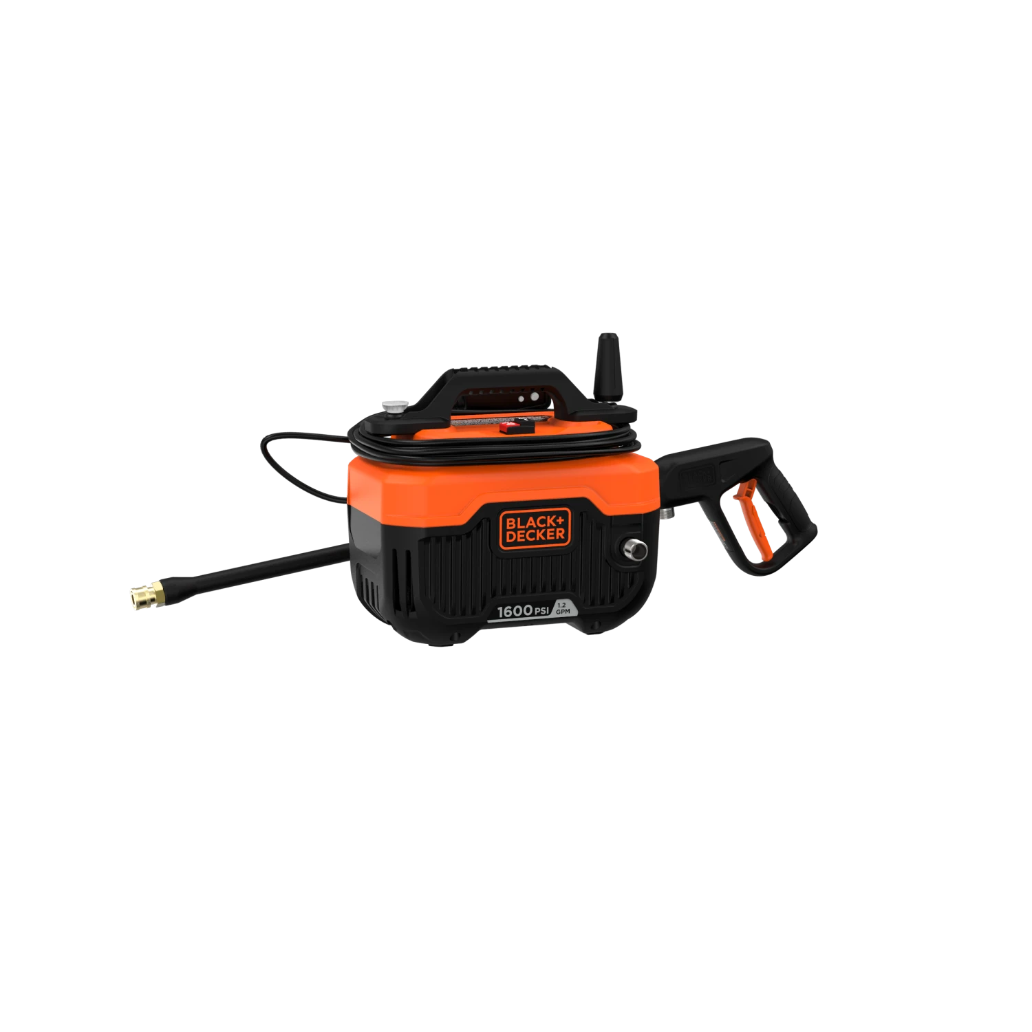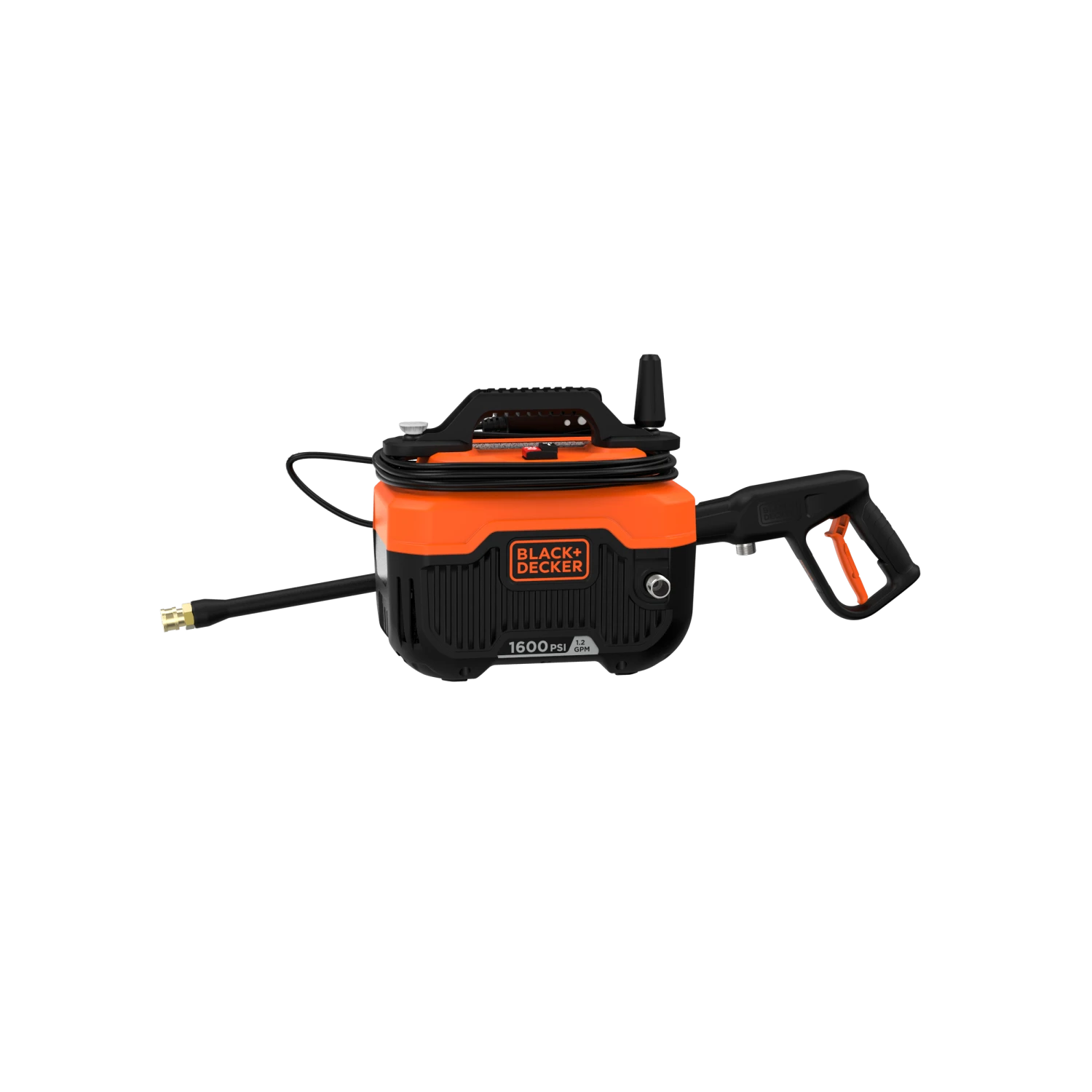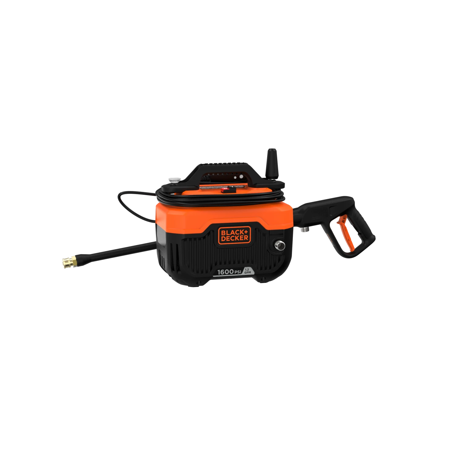 BLACK+DECKER® 1,600 max psi 1.2 gpm electric corded cold water pressure washer includes a power cord, hose, turbo nozzle, and a 40 degree nozzle that delivers up to 145% more* cleaning width.
