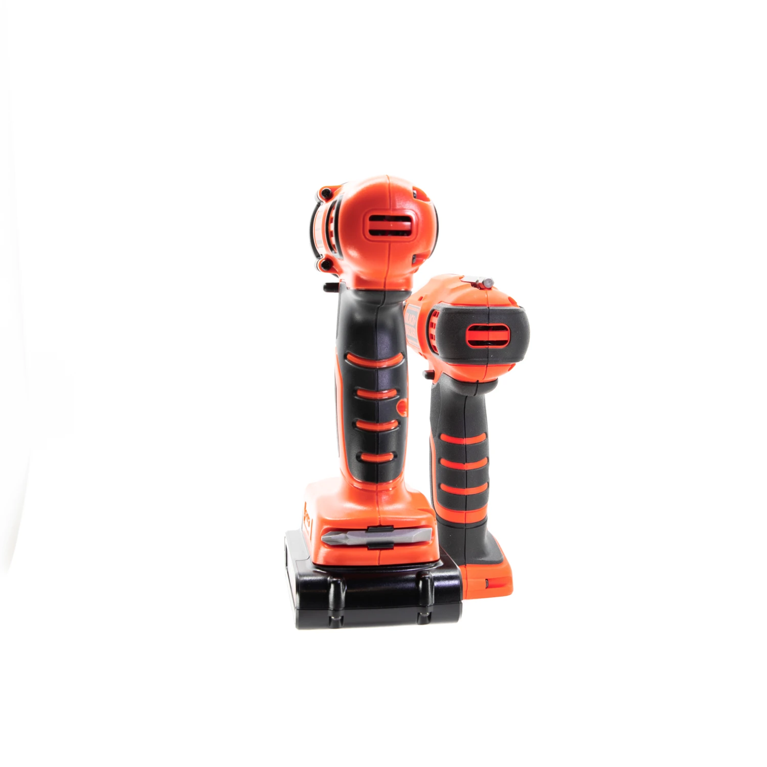 BLACK+DECKER® 20V MAX* 3/8 inch lightweight, compact, cordless drill/driver and impact driver combo kit. The drill has an 11-position clutch and a variable-speed trigger. The impact driver includes a quick-release 1/4 inch hex chuck. Both include a built-in LED work light, and both use interchangeable 20V MAX* POWERCONNECT™ lithium ion batteries.