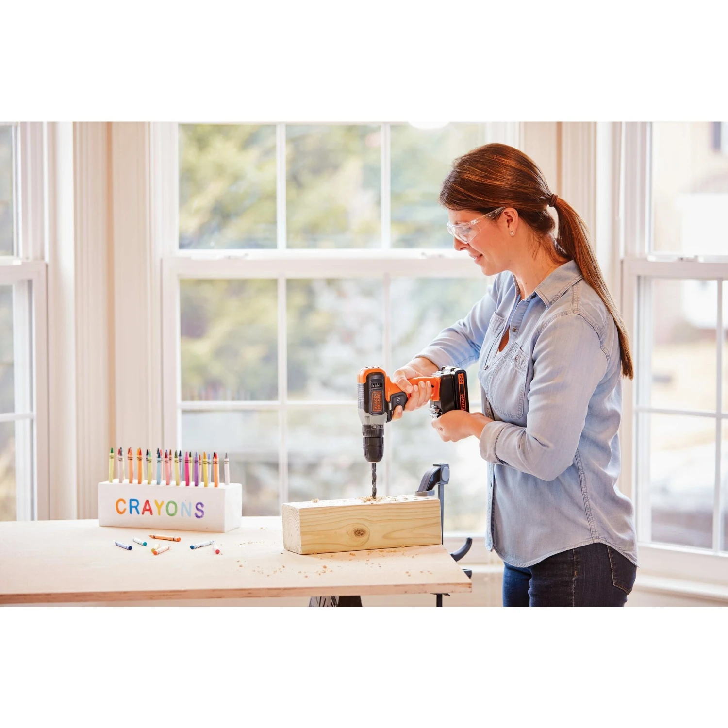 The BLACK+DECKER® 20V MAX* cordless drill combo includes a 66-piece home project kit, packaged in a handy tool box.