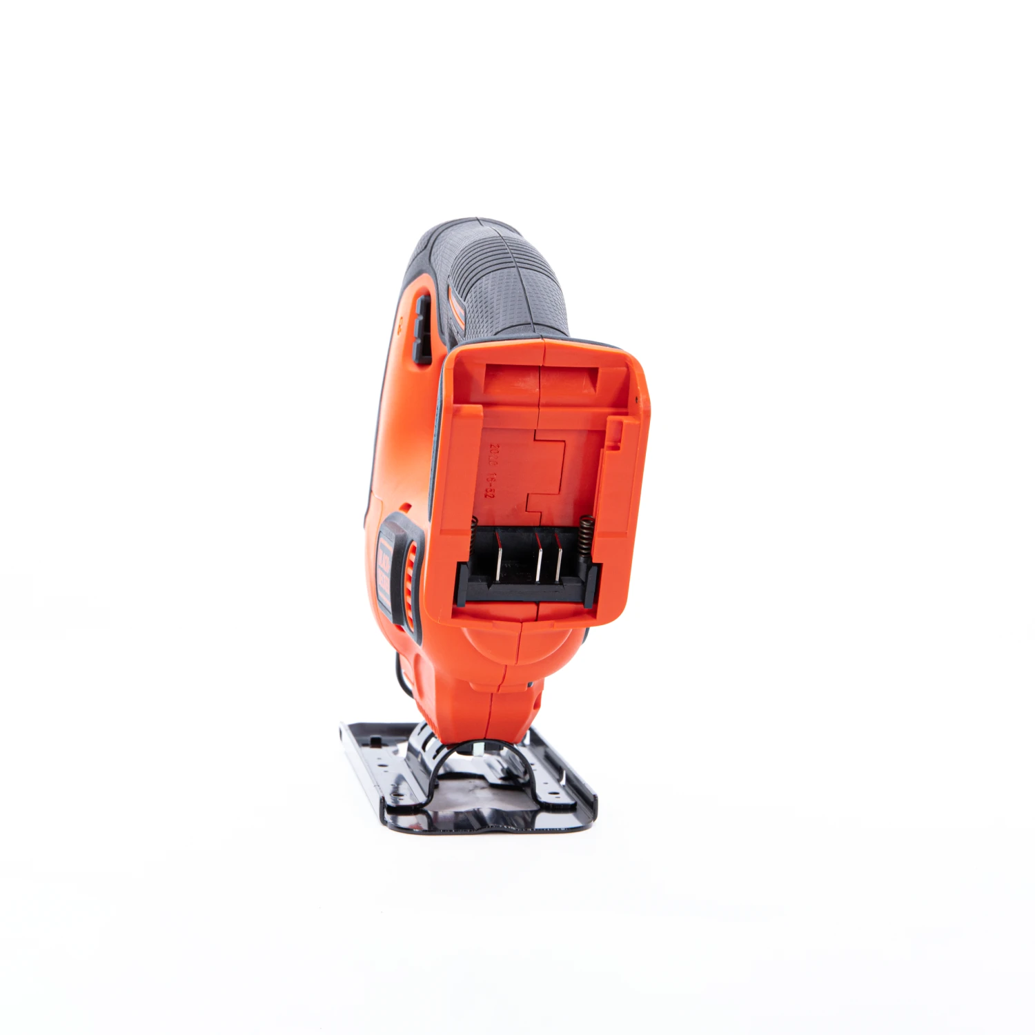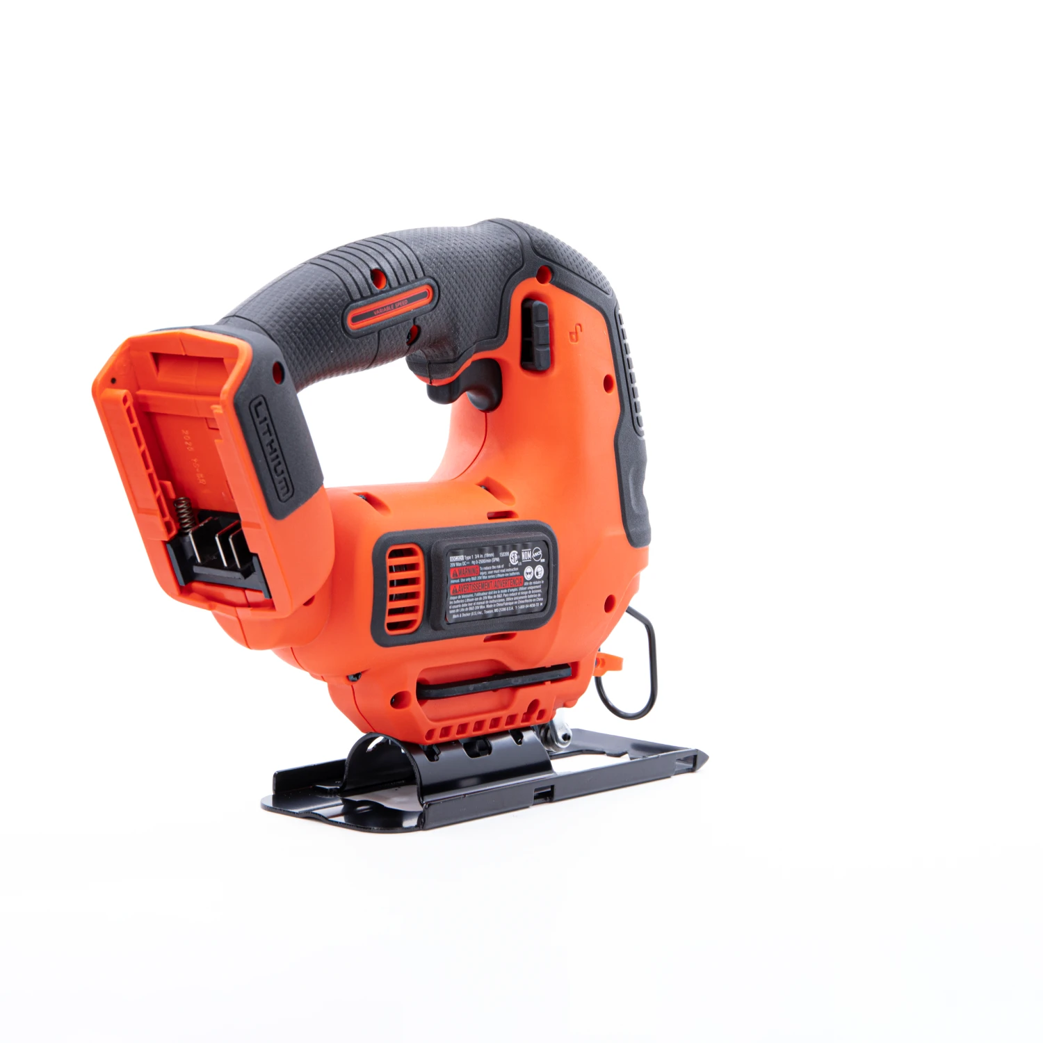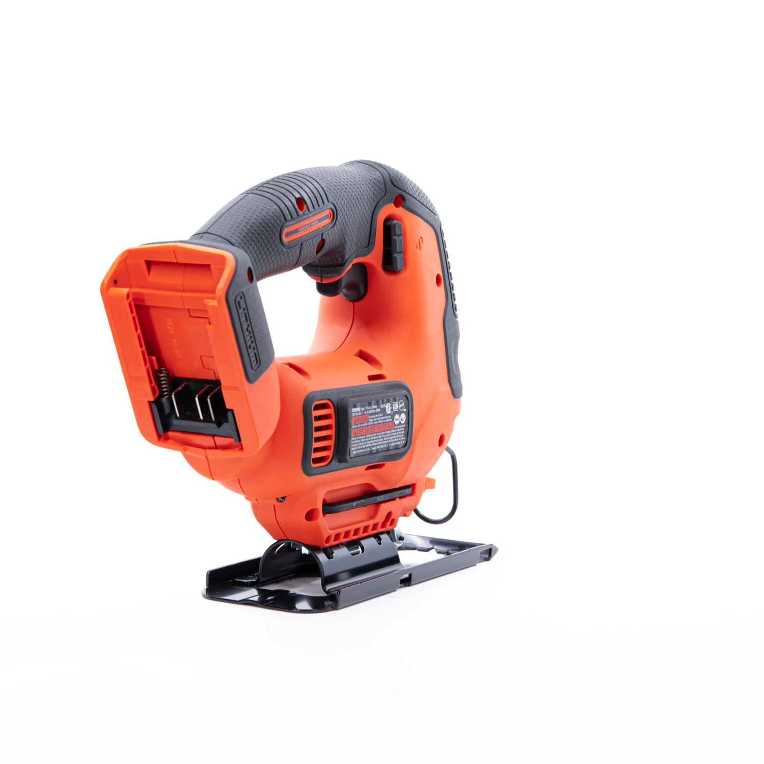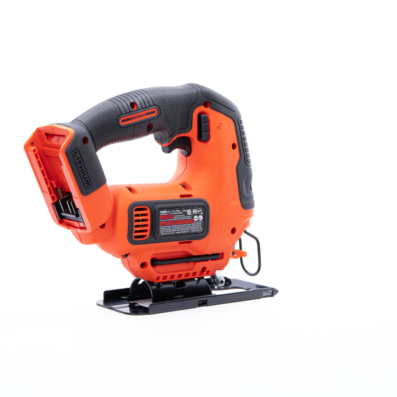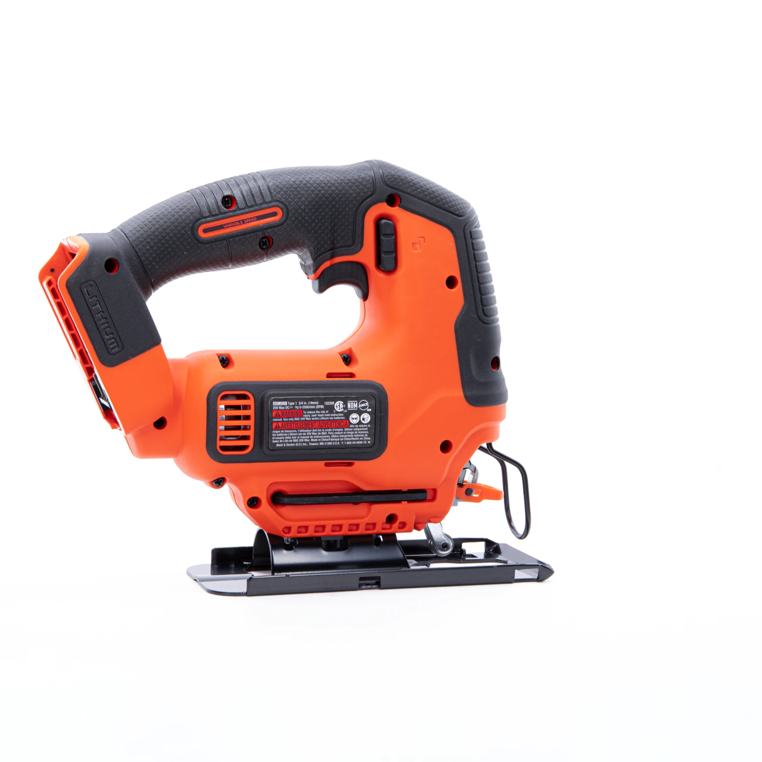 The BLACK+DECKER® 20V MAX* POWERCONNECT™ cordless jig saw has a variable-speed trigger and an output of up to 2,500 rpm (rotations per minute). A bevel shoe with an angle capacity of up to 45 degrees in both directions is included, as is a wire guard and built-in blower. Battery not included.