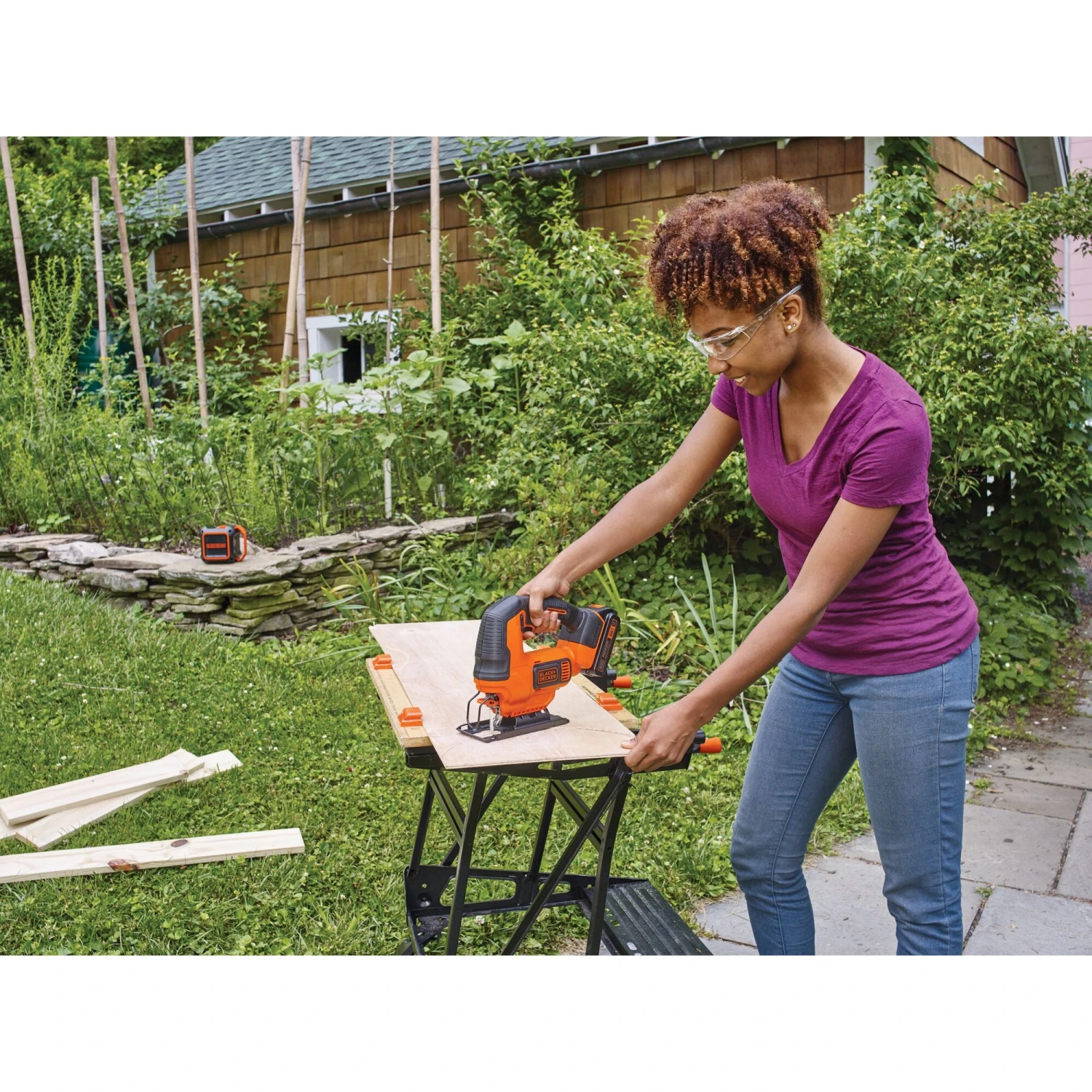 The BLACK+DECKER® 20V MAX* POWERCONNECT™ cordless jig saw has a variable-speed trigger and an output of up to 2,500 rpm (rotations per minute). A bevel shoe with an angle capacity of up to 45 degrees in both directions is included, as is a wire guard and built-in blower. Battery not included.