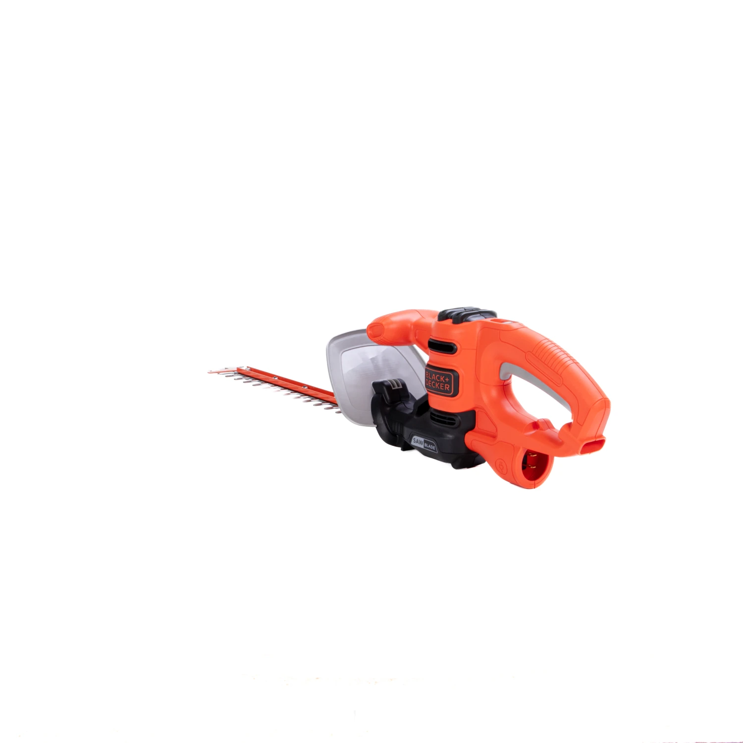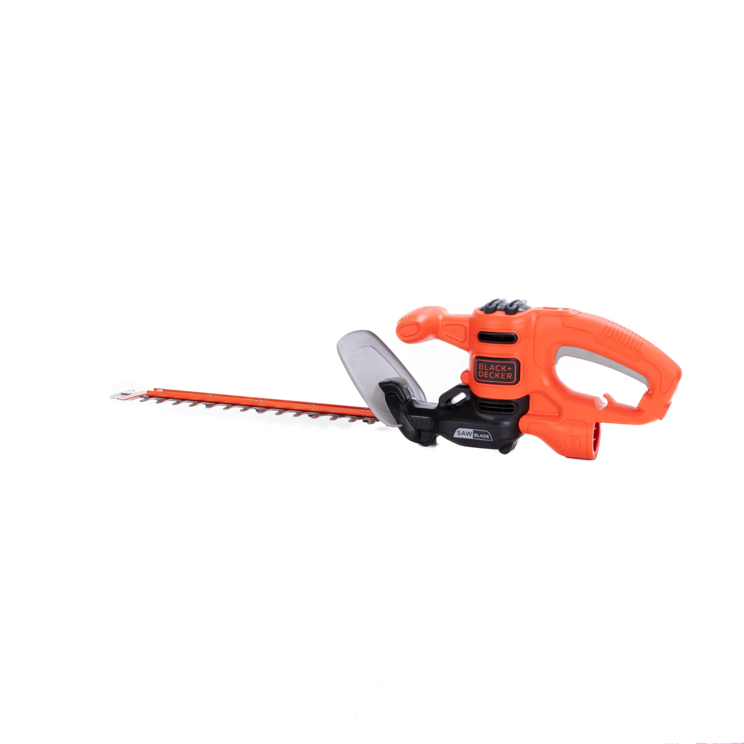 BLACK+DECKER®’s 3.0 Amp 16 inch corded electric hedge trimmer cuts branches up to 5/8 inch thick and features a dual-action, hardened steel blade to minimize vibration. It has a saw blade located at the end of the dual-action blade to cut thicker branches up to 1 inch in diameter. A built-in T-handle and full-length trigger are included.