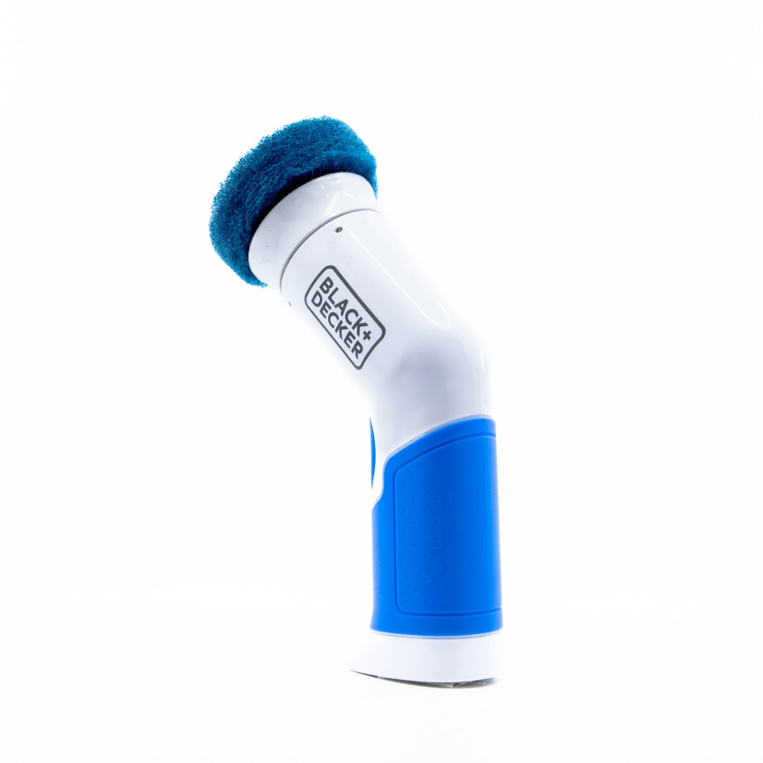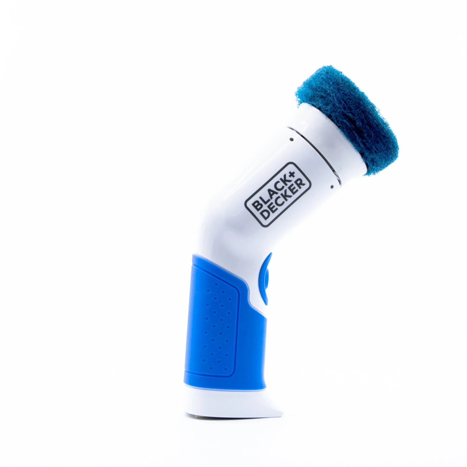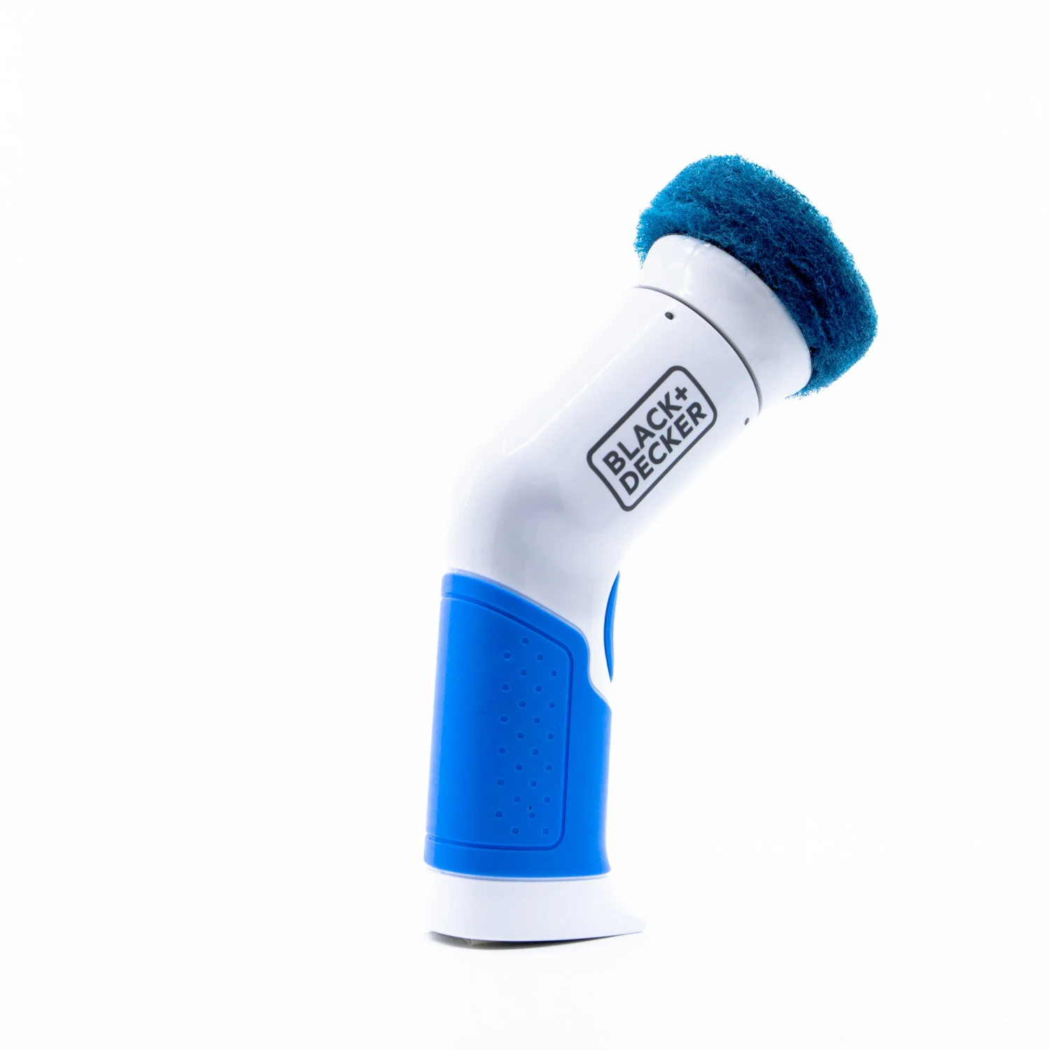 BLACK+DECKER® fully submersible power scrubber has a scraper edge. Included are: power scrubber, 4 AA Batteries, 2 heavy duty scrub pads.