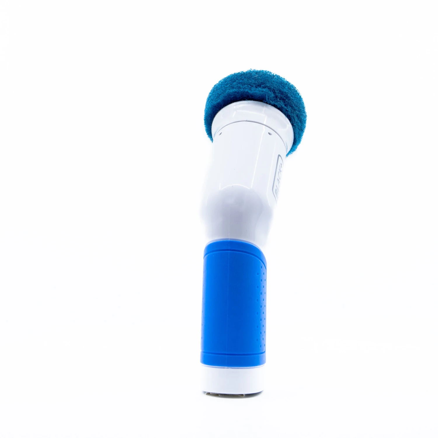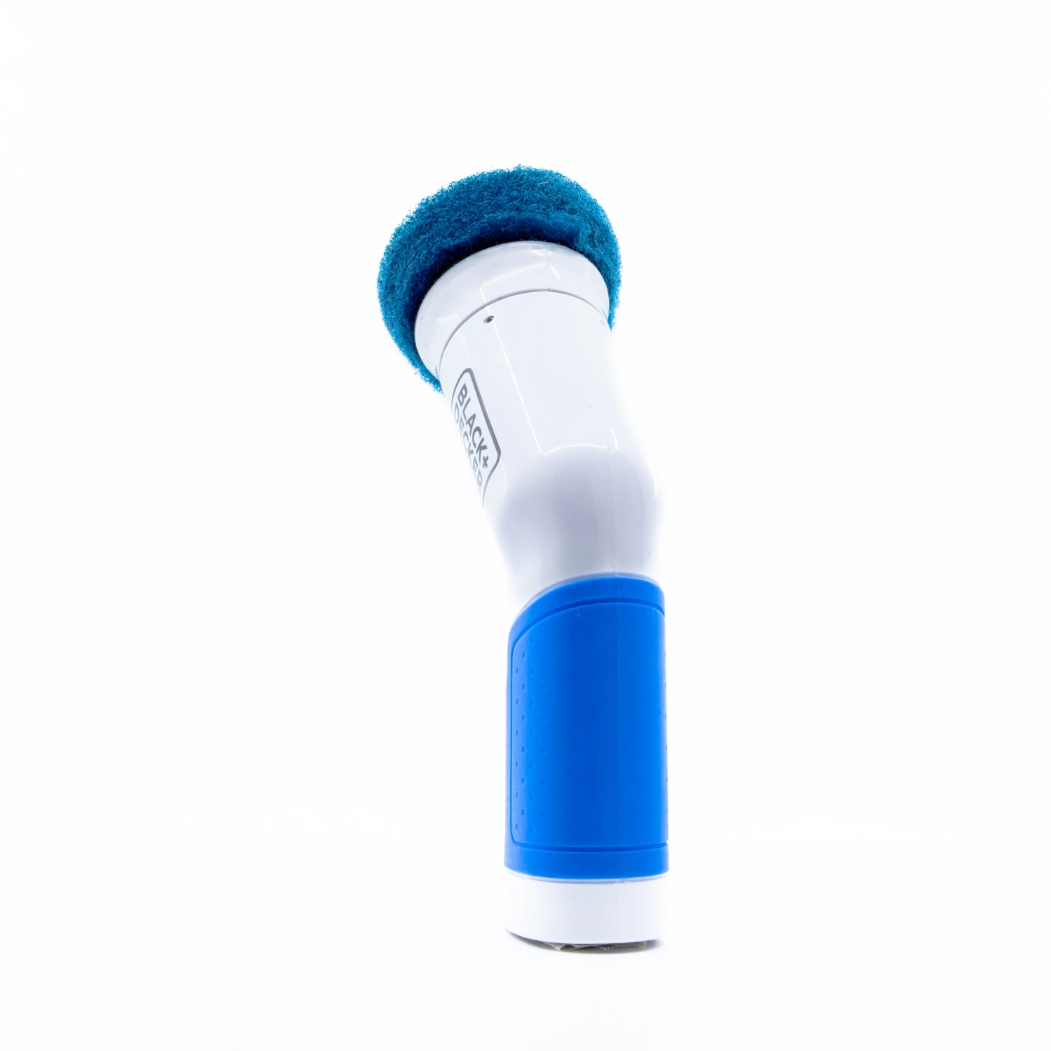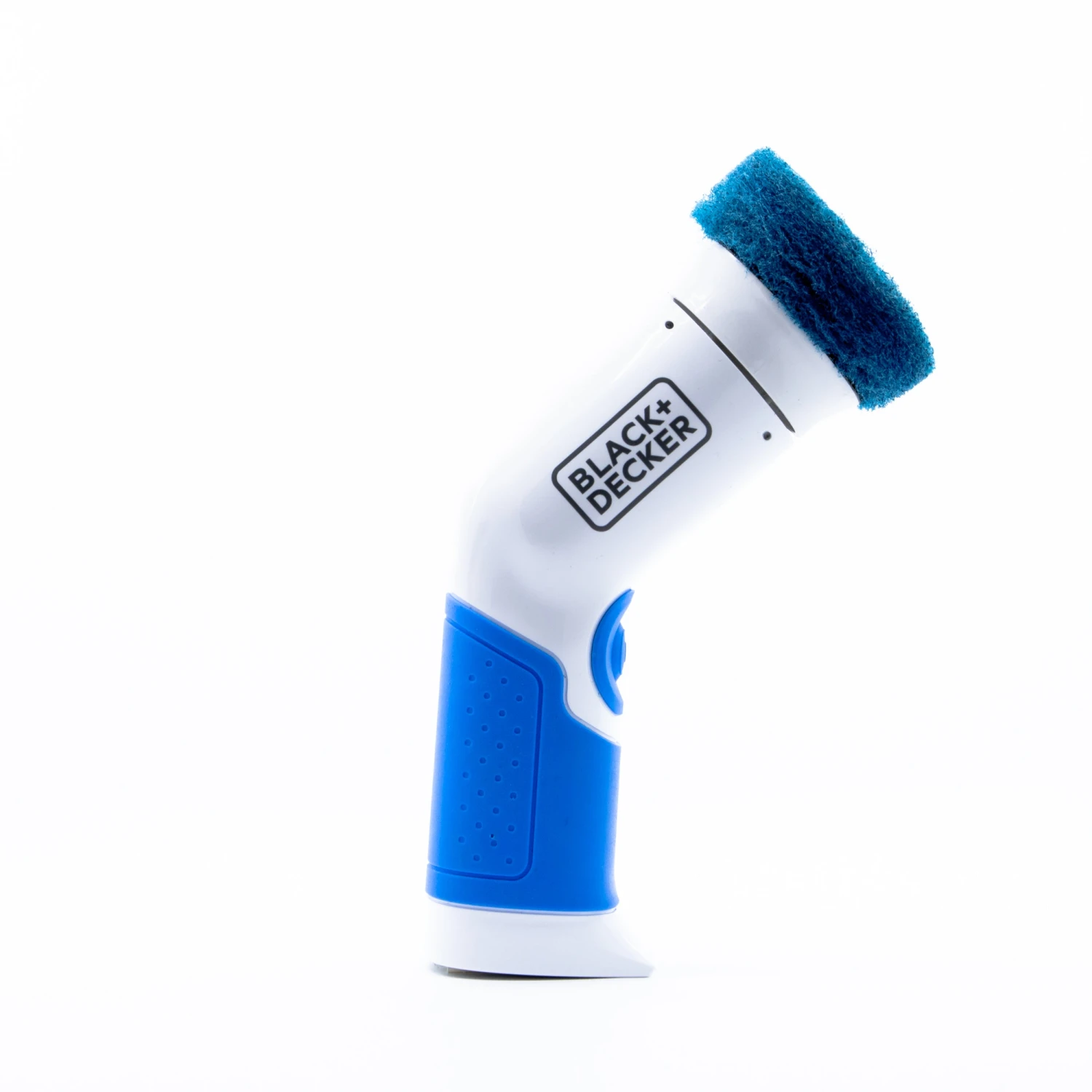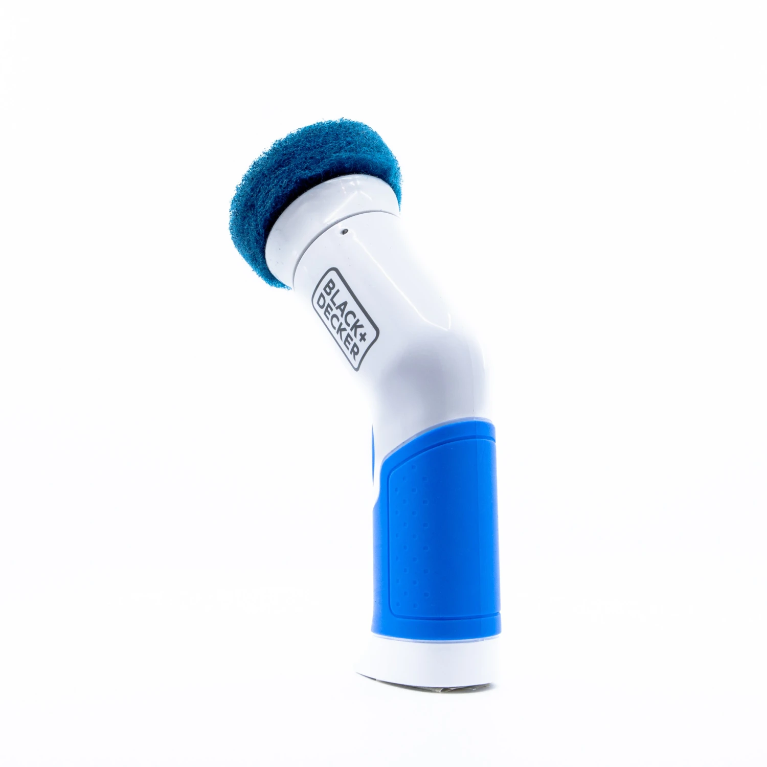 BLACK+DECKER® fully submersible power scrubber has a scraper edge. Included are: power scrubber, 4 AA Batteries, 2 heavy duty scrub pads.