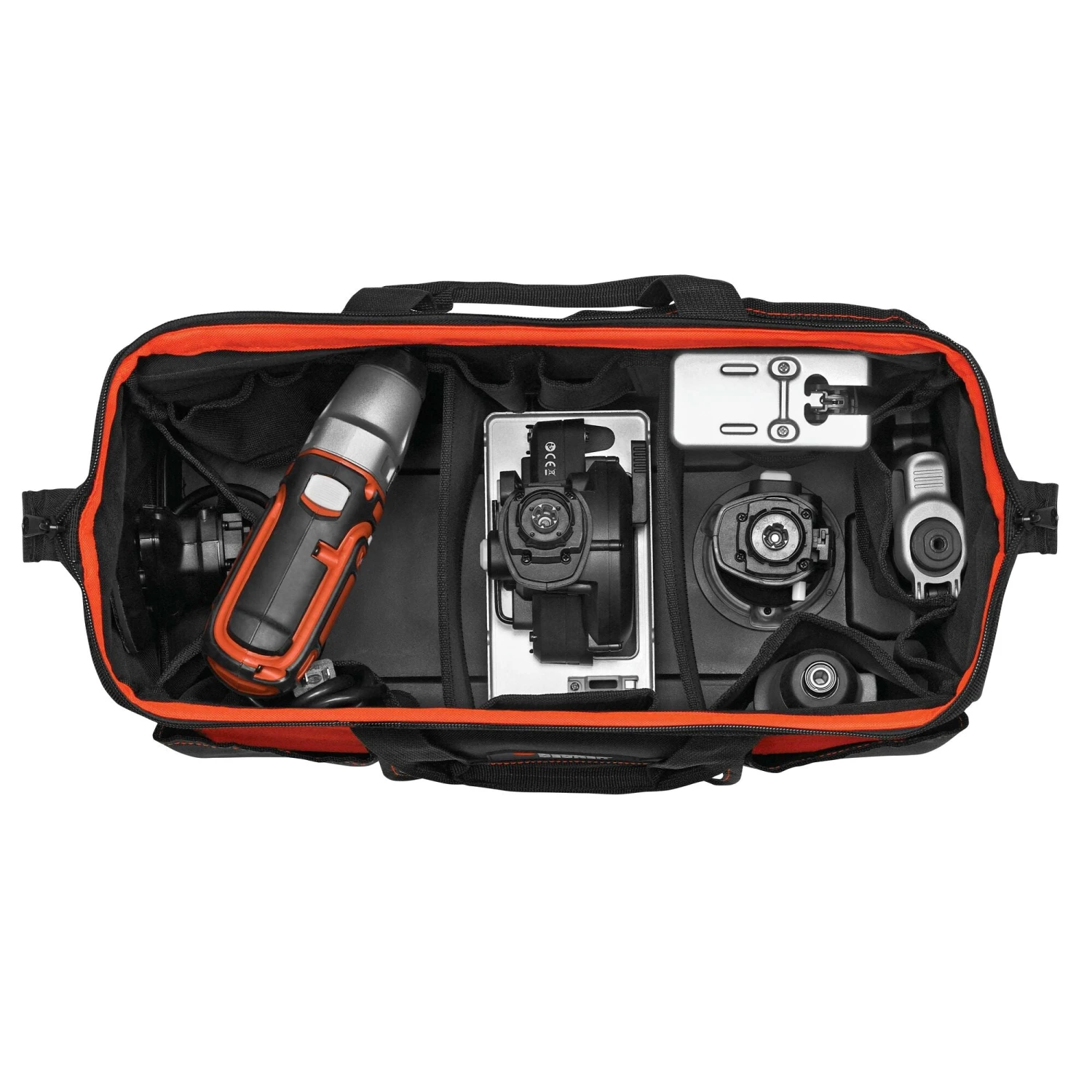 The BLACK+DECKER® MATRIX™ wide-mouth tool storage bag comes with internal pockets and makes it easy to carry your MATRIX™ system. Features a plastic base, zippered opening, and adjustable shoulder strap. MATRIX™ tools and accessories sold separately.